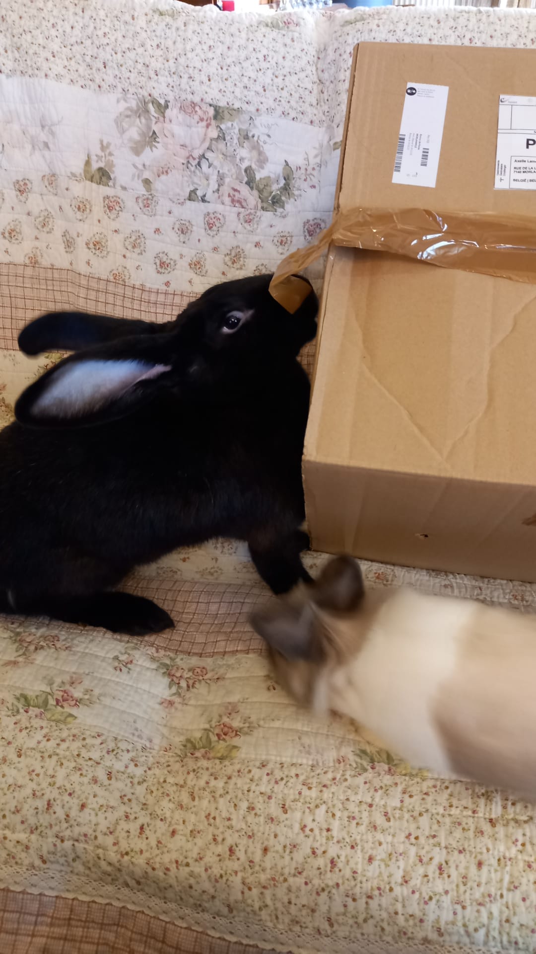 Last but not least, le Père Noël a rendu visite à notre troisième duo magique et là aussi, notre amie à quatre pattes en question était particulièrement curieuse du contenu. Cela n’allait pas assez vite pour Opale…elle avait déjà vérifié chaque côté de la boîte avant qu’Axelle ne lui montre ce qu’elle contenait. Vous seriez probablement tout aussi impatient.e si une balle à ronger en bois remplie de friandises et un bâton à ronger vous attendaient ! Pour Opale, cela lui a semblé une éternité pour que la friandise soit sortie de l’emballage. Son copain Havana est également venu jeter un coup d’œil mais le partage s’est avéré difficile car toutes les friandises ont fondu comme neige au soleil. Quand Opale a remarqué qu’il y avait aussi un panier douillet, elle a perdu patience et l’a emporté avec ses dents alors qu’il était encore dans la boîte !